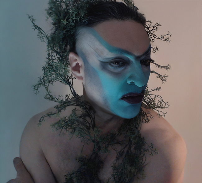 The image is washed in aquamarine, giving it a submerged, almost suspended atmosphere. The head rises through a dense accumulation of organic material that could be read as foliage, marine growth, or unruly hair. This mass does more than surround the figure—it fuses with it. The boundary between body and environment breaks down, leaving the figure embedded within its surroundings. It feels less constructed than uncovered, as though it has surfaced from an unfamiliar terrain where definitions no longer apply.