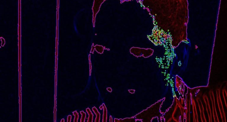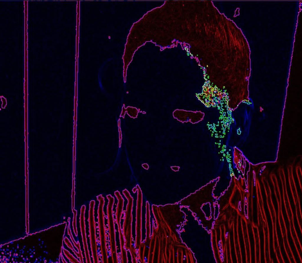 The transformation is striking. The original image is pushed into a high-contrast, almost electric state. Edges glow in neon tones—reds, blues, greens—while large areas of the face fall into shadow. The eyes, nose, and mouth are reduced to minimal outlines. The result is both recognizable and obscured. Bernadine is still there, but she is also partially erased, translated into something closer to a digital trace than a physical presence.