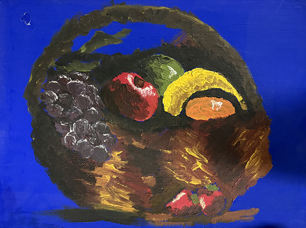 “Still life – still love” initially appears to sit within a familiar tradition. At the front, a basket of fruit is arranged with calm balance. The composition feels measured, almost timeless. Still life, as a genre, often suggests stability and completion, and here that sense is present. The fruit reads as a symbol of fullness, something intact and at rest.