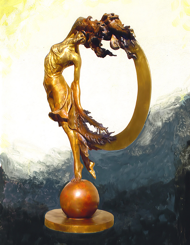 In Sunriser, Carlyle brings together ideas of balance, elevation, and renewal. The figure stands on a sphere, immediately introducing a sense of instability. Behind it, a large circular form echoes the image of a rising sun.