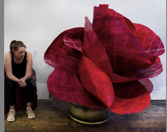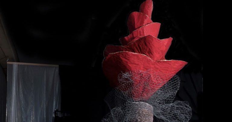 In The Gift, Karalla shapes these pages into a large red form that recalls the structure of a rose. The scale immediately changes the experience. It is not intimate or decorative—it occupies space in a way that feels unavoidable. The material itself, fragile as paper, gains strength through repetition and construction. The use of red adds weight to the piece, connecting the familiar symbol of the rose with the intensity of the subject matter embedded in the pages. The form suggests both an offering and something more complicated—something given, but not easily received or resolved.