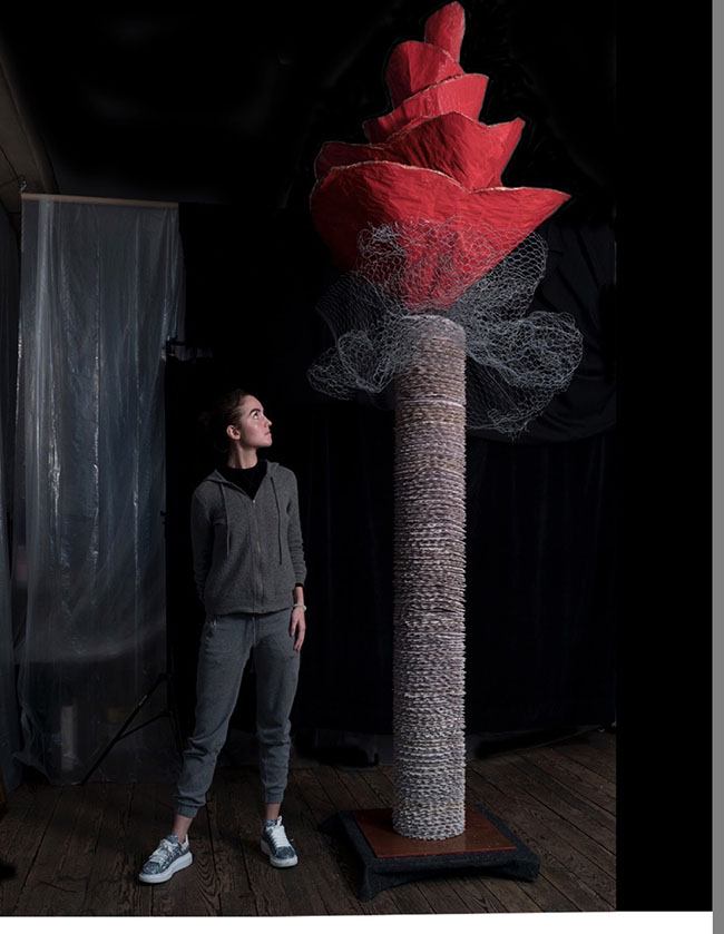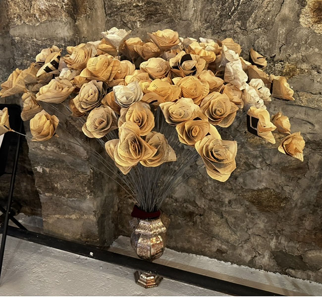 This line of thinking expands in The Pillar of Truth, where roughly 20,000 pages are assembled into a tall, column-like structure. Here, the emphasis shifts from a single form to the idea of accumulation. The work becomes about scale—of information, of narrative, of burden. The vertical structure echoes monuments or architectural forms, reinforcing the sense of weight and permanence. At its top, the rose reappears, acting as a focal point. The piece does not ask the viewer to read everything contained within it, but instead to consider what it means to be faced with something so extensive. It becomes less about detail and more about magnitude.