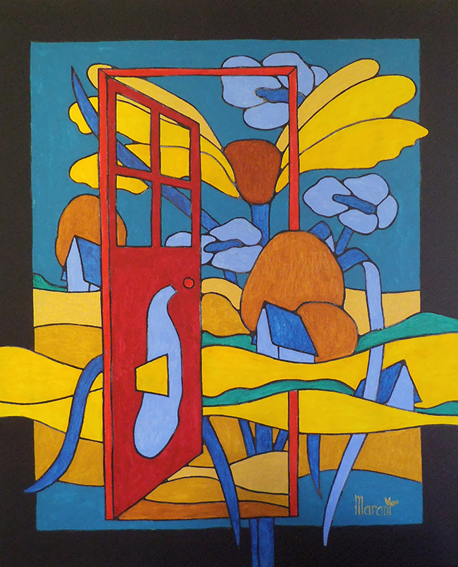 In Opening onto the Dragonfly Flower (2025), Marant creates a scene that holds a quiet tension between openness and containment. A red door stands in the foreground, slightly open, suggesting both access and separation. It does not lead to an interior space. Instead, it reveals a landscape built from flattened shapes and saturated color. Bands of yellow stretch across the composition, interrupted by blue and green elements that read as plants, stones, or fragments of terrain. Above, simplified floral forms rise, their rounded shapes repeating throughout the image.