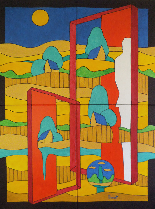 Color continues to organize the image. The yellow fields stretch across the surface, creating continuity. The blue sky, marked by a simple circular sun, adds clarity and balance. Against this, the red frames stand out with strong, uninterrupted lines. The white figure, held within this structure, feels both anchored and detached. It exists within the space, yet remains separate from it.