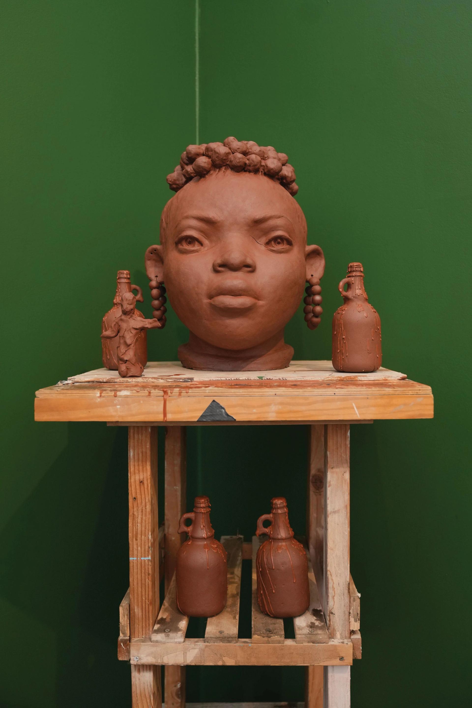 Mustafa Ali Clayton’s large-scale ceramic busts are built by hand, without molds, meaning they are “imperfect” and visual embodiments of the creative act. Displayed on makeshift plinths that evoke their materiality, they are nevertheless robust, designed to be displayed both indoors and outdoors. Their strength is a reference to the idea of ”Black women as a resilient and robust group,” Harden says, adding that they offer a way to “reimagine figuration” and the historical tradition of bust making.