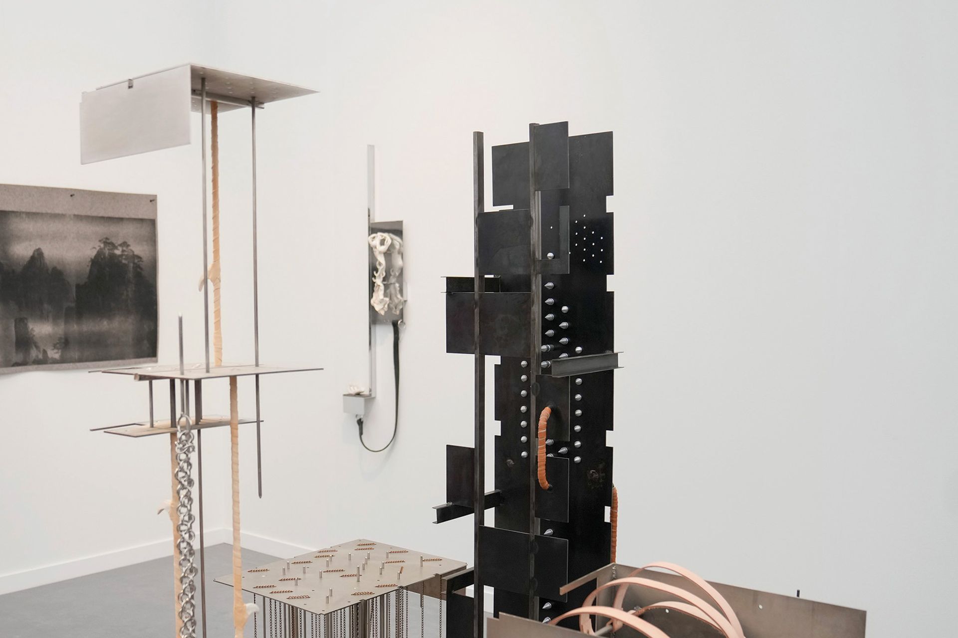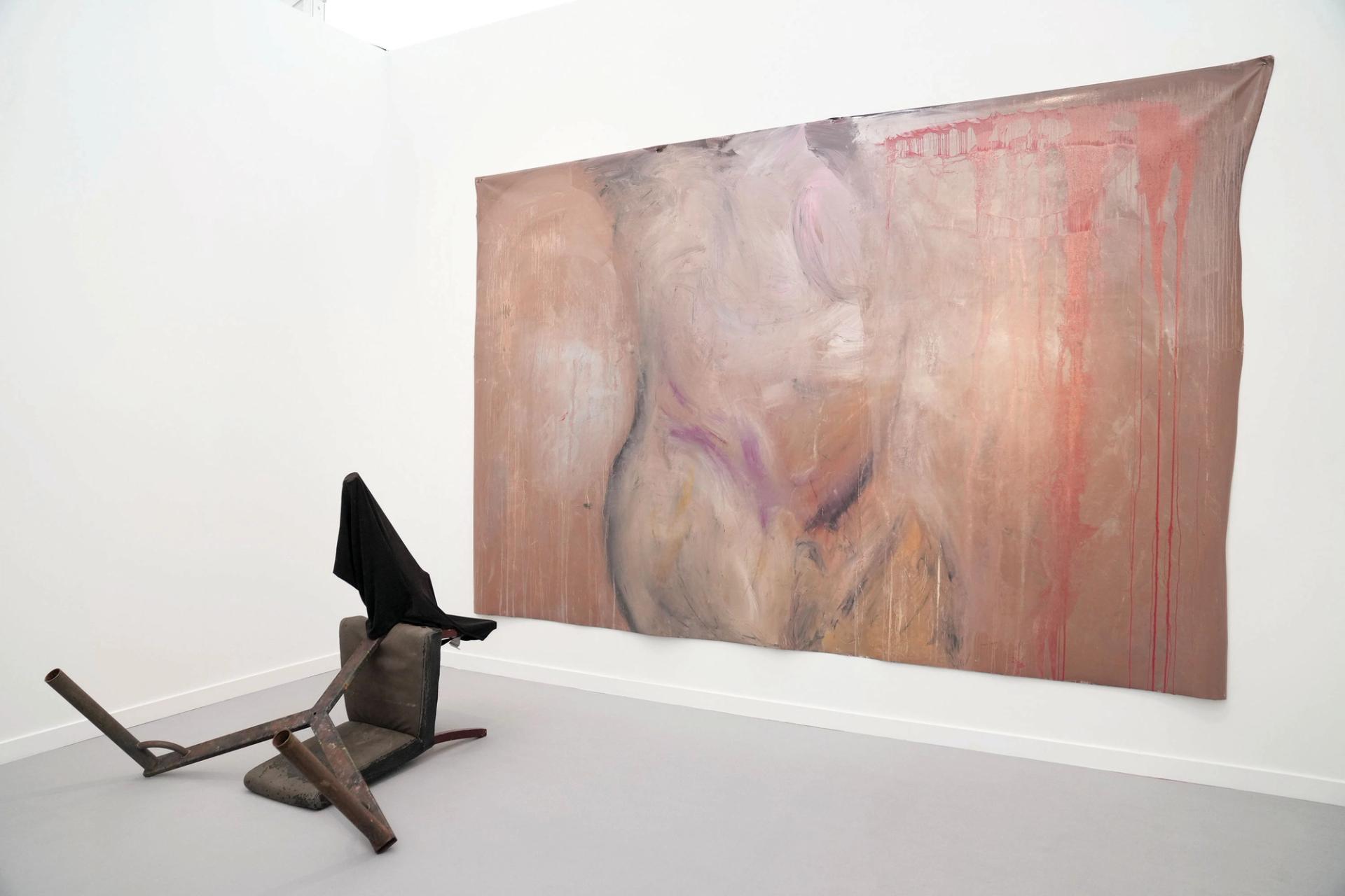 “When I think of 21st-century montage, I think of her,” Harden says of Serpas, who grew up in Boyle Heights. Quinn Harrelson’s stand as a whole presents paintings and sculptural works meant to be understood in unison; one of the two paintings, for example, represents the torso of a woman, while the other simply presents brushstrokes, evoking the tool used by the artist to create the figurative work. “I love his work, and montage in general, because it’s about imbuing objects with energy and spirit,” says Harden. “The works are always united.”