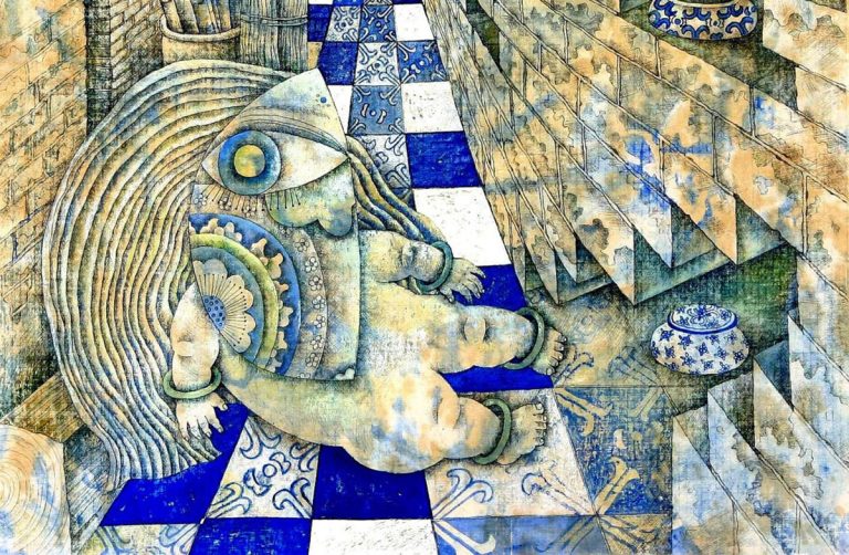 A seated figure appears in the foreground, merging human and symbolic elements. The form is compact, almost sculptural, and echoes the textures seen throughout the piece. This figure does not dominate the space but exists within it, as if shaped by the same forces that formed the walls and objects around it. The repetition of ceramic motifs creates a visual rhythm, reinforcing the idea of continuity—tradition repeating itself across time.