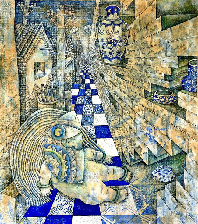 In Windless Day (82 x 90 cm, mixed media on paper), Huang shifts the atmosphere. The palette leans heavily into blue and white, immediately recalling traditional porcelain. A tiled floor stretches into the distance, forming a strong perspective that pulls the viewer inward. On either side, walls close in tightly, lined with vessels that float or rest in improbable positions. The space feels both architectural and surreal, structured yet unstable.
