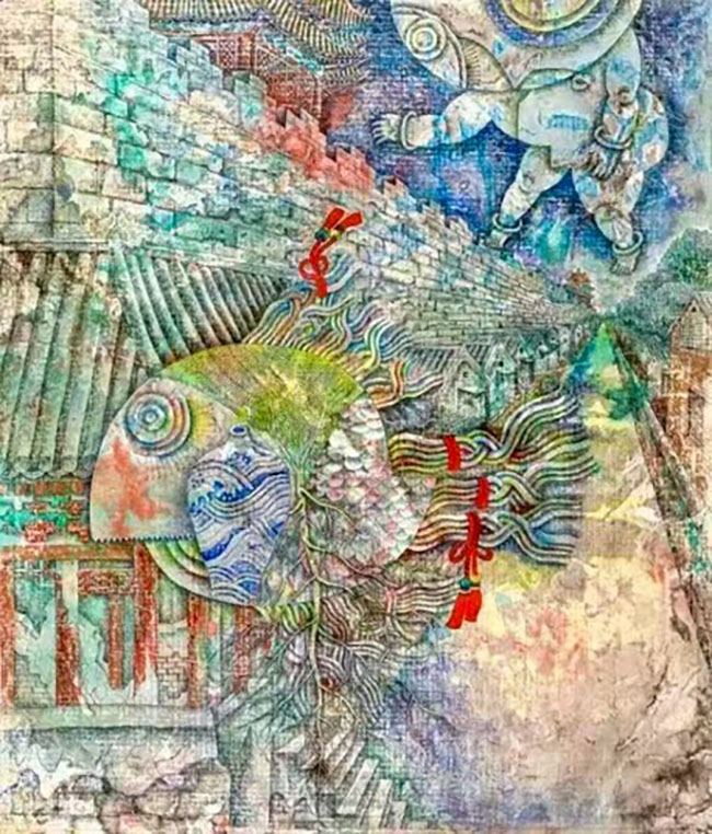 Color plays a subtle but deliberate role here. Faded greens, reds, and muted earth tones echo the weathered surfaces of old Beijing walls. These tones are not decorative; they evoke age, time, and exposure. The presence of the fish, paired with architectural fragments, creates a tension between permanence and movement. Buildings are fixed, rooted in history, while the fish glides freely, almost defying gravity. This contrast suggests a quiet longing for release, or perhaps a reflection on how memory itself moves through static environments.