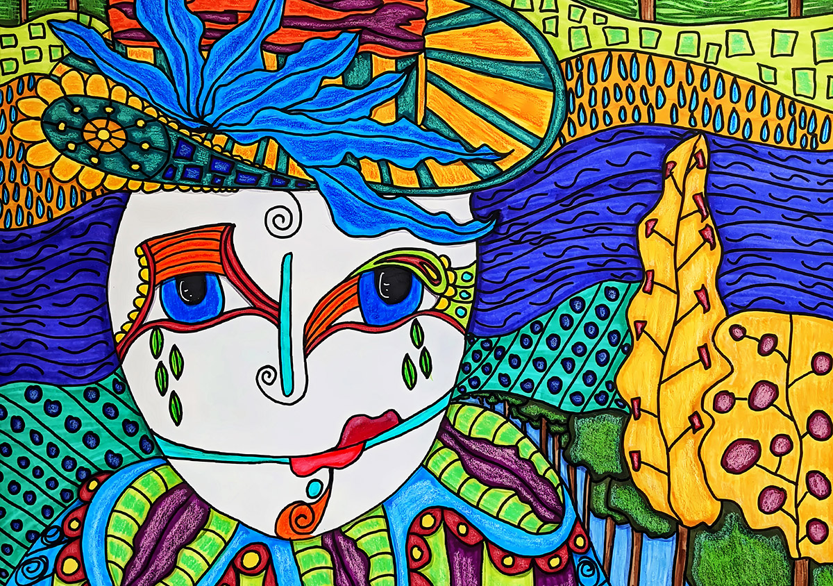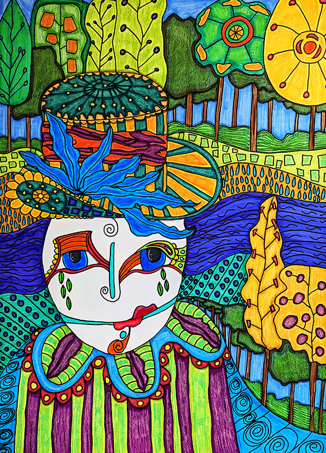 Color plays an important role in shaping the mood of the piece. Vibrant tones bring life and energy to the landscape, while patterned elements guide the eye through the composition. Instead of creating a static scene, the painting suggests movement and interaction, as though the environment itself is breathing.