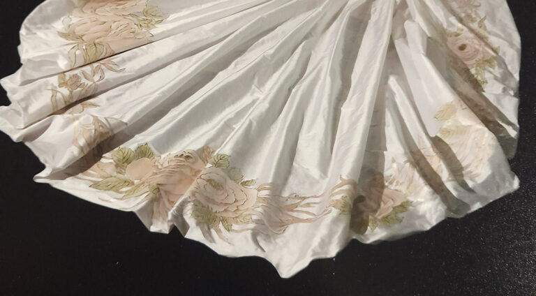 From 1999 to 2016 she devoted herself to silk works made for haute couture. These were not decorative designs but full expressions of artistry worn on the body. Once in motion, they transformed into living artworks. Fabric and brush merged, creating canvases that breathed with the wearer. Each piece carried a distinct presence, a story stitched not only into its colors but into the act of wearing it.