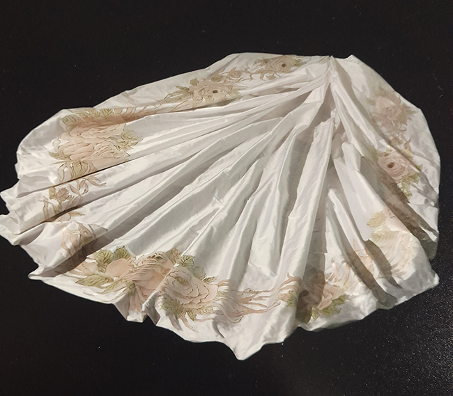 Looking at her work, one notices devotion to detail. A silk garment painted by hand becomes a moving story of color and light. An engraving etched in ink becomes a vessel for time itself. Both invite us to linger. Both remind us that material—whether soft as cloth or hard as paper and metal—carries meaning.