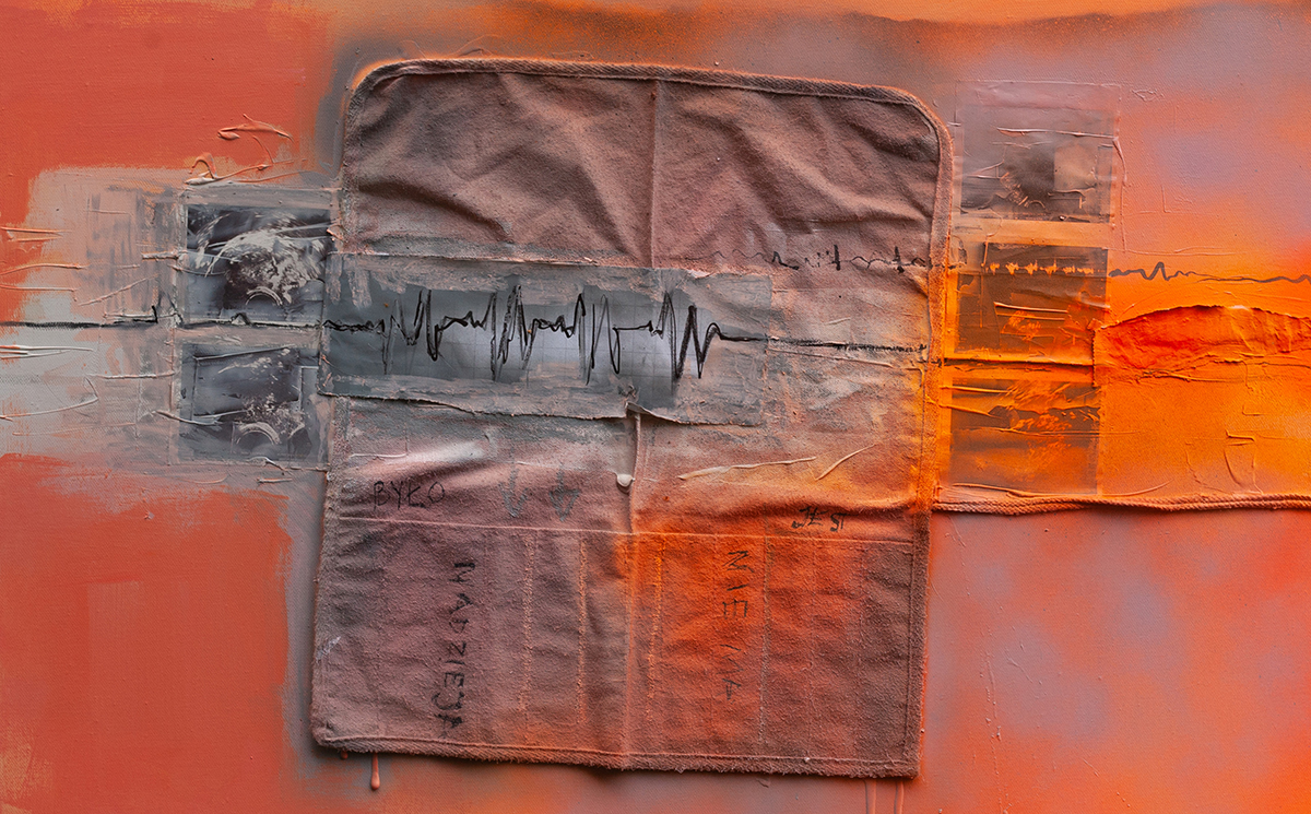 The center of the canvas features stitched or layered fabric pieces, folded and pressed into the surface. These carry drawn lines resembling an electrocardiogram, a heartbeat wave. It feels fragile, as if the canvas itself has been wired to register its own pulse. Husarska plays with this duality: the artificial graph of a machine and the raw, tactile material of fabric pressed into paint. The effect is uncanny. One feels both the science of measurement and the intimacy of touch.