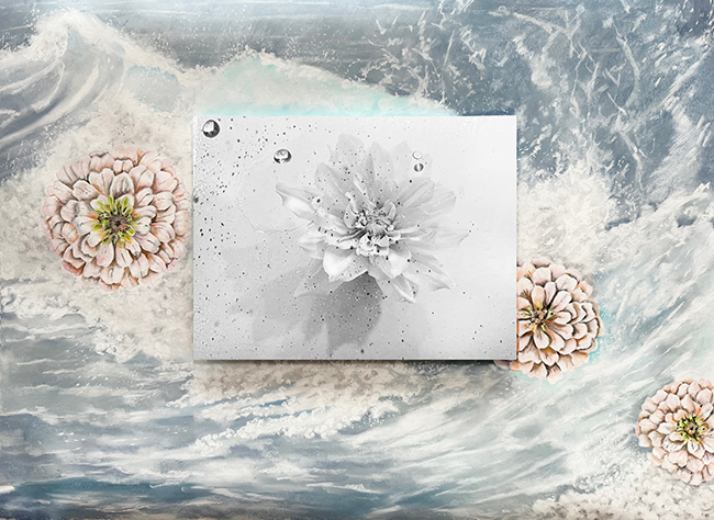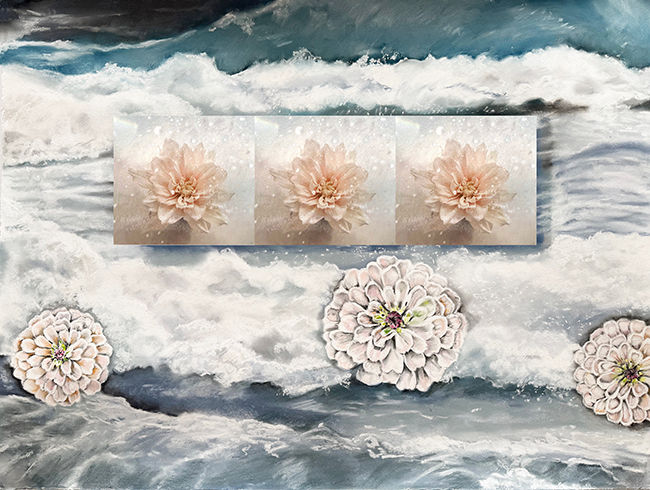 Her work rewards patience. It does not reveal itself immediately. Instead, it invites the viewer to spend time with it, to notice the small shifts in color, texture, and form. As these details begin to connect, the initial contrast between elements softens. Water and flower, stillness and motion, photography and pastel begin to work together as one.