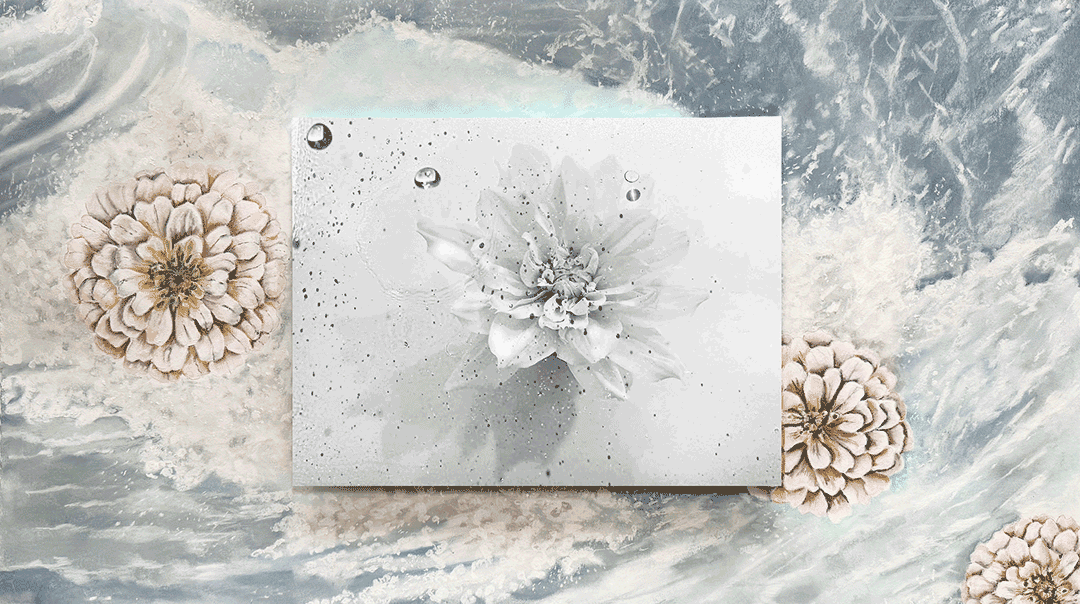 In The Blooming of Froth, the structure opens up. Instead of a single focal point, three flowers stretch across the center, forming a horizontal sequence. This interrupts the vertical movement of the waves and changes how the image is read. The viewer’s eye moves from side to side, following the repetition, before returning to the motion of the water behind it. The palette here feels warmer, but the connection to movement remains. The flowers are not static forms. They carry the same sense of energy as the ocean, as if they are part of its continuous flow.