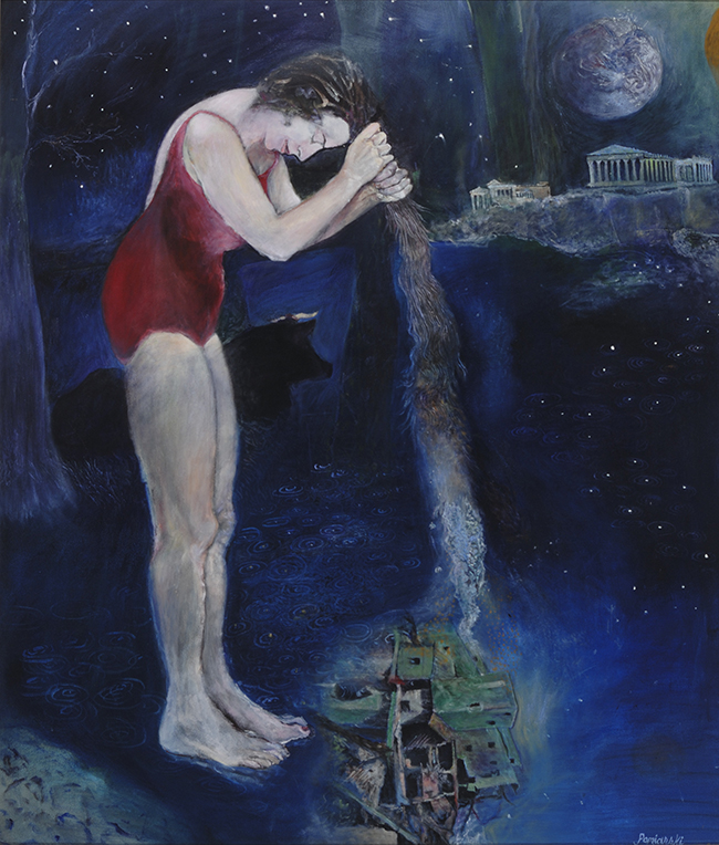 This work feels deeply personal and mythological at once. The figure could represent memory, creation, or renewal. By pouring water into a submerged city, she becomes both destroyer and giver of life — an echo of ancient deities tied to the cycles of nature and emotion. Poniarski’s background in architecture subtly surfaces here: the ruins and structures are rendered with care, as though the artist is both dismantling and rebuilding meaning through paint.