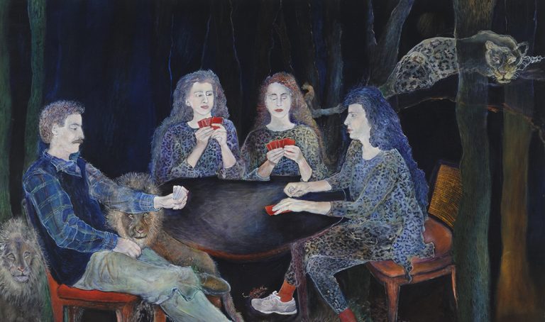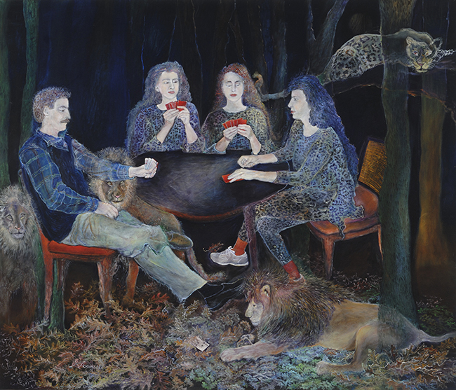 In Who’s Game, Poniarski constructs a mysterious, almost theatrical scene. Four figures sit around a card table in a dimly lit forest, their expressions tense and unreadable. The atmosphere is both familiar and unsettling. The players, dressed in patterned garments, appear engaged in a quiet psychological duel. Lions rest beneath the table and behind the chairs — guardians, perhaps, or manifestations of inner instinct and pride. Their presence transforms an ordinary card game into a symbolic meditation on competition, trust, and dominance.