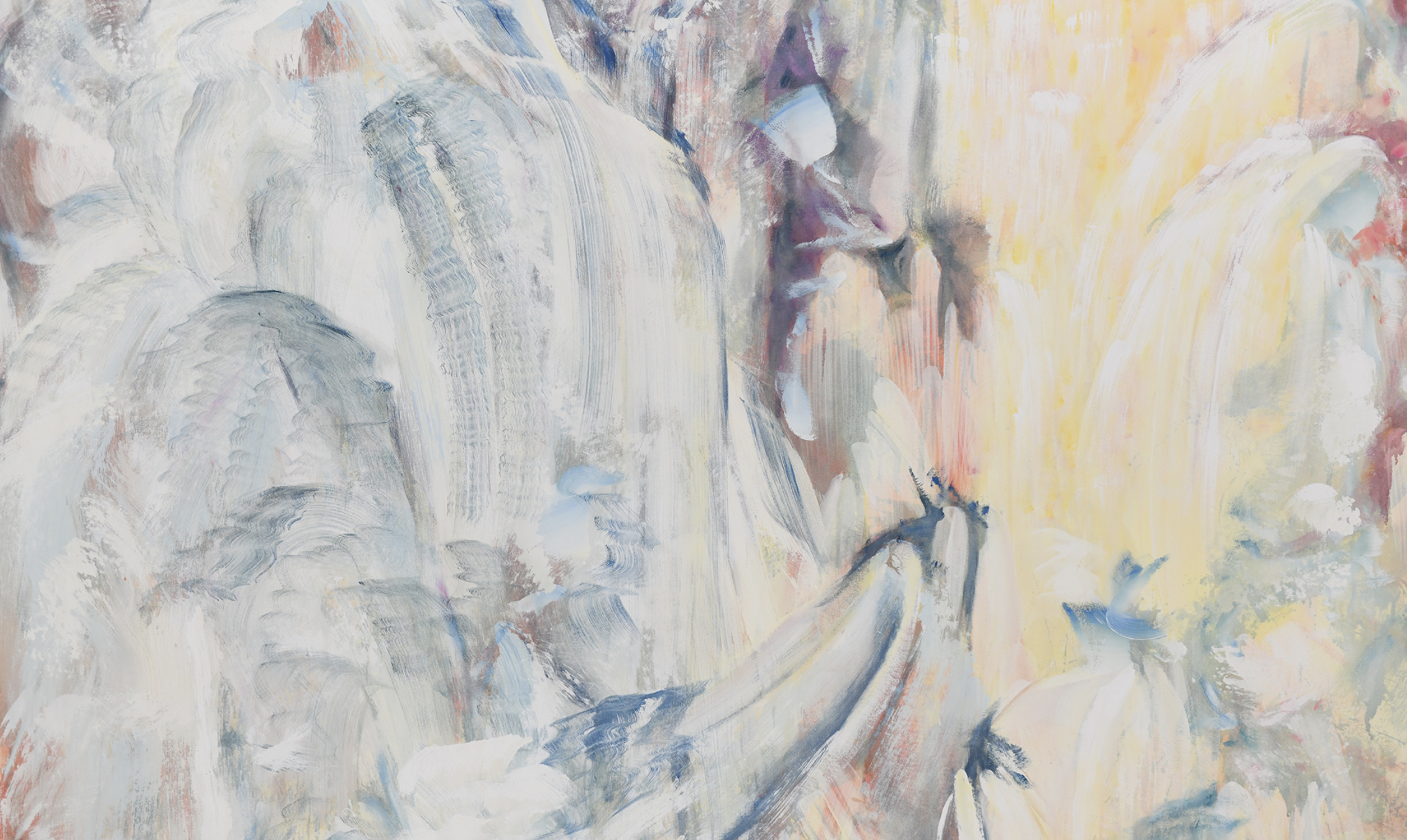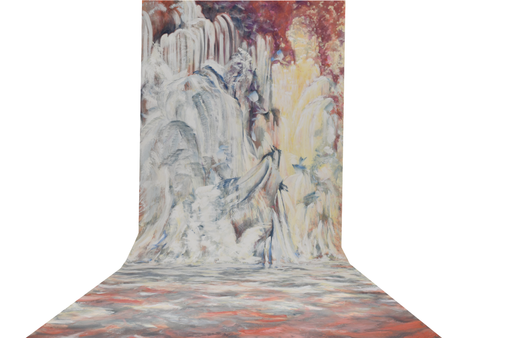 Rechberg’s interdisciplinary background informs her handling of both material and space. The canvas behaves less like a flat support and more like a performative element. Its extension onto the floor enhances the sensation of immersion; one can almost feel the weight of cascading water and the shimmer of refracted light. The experience becomes bodily as much as visual. Rather than presenting a static scene, the work generates an atmosphere—an environment shaped by motion and energy.