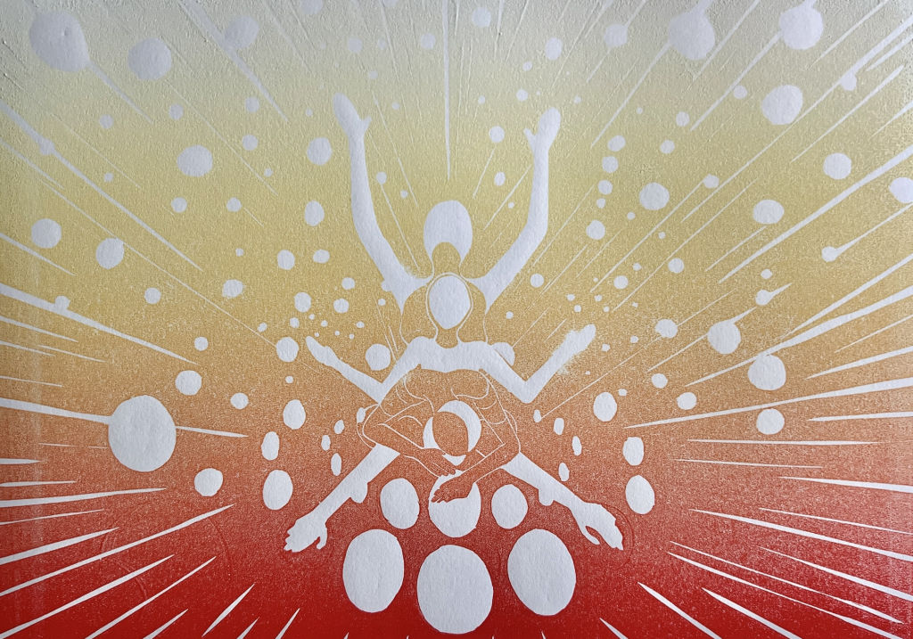 The composition centers on a stylized human figure, rendered in white against a radiant gradient that shifts from deep crimson at the bottom to luminous gold at the top. The body appears multiplied, with arms extending outward and upward in layered gestures that evoke surrender, emergence, and ascension simultaneously. Surrounding the figure are scattered circular forms—white spheres that may read as cells, planets, or seeds—while sharp, radiating lines amplify the sensation of outward expansion.