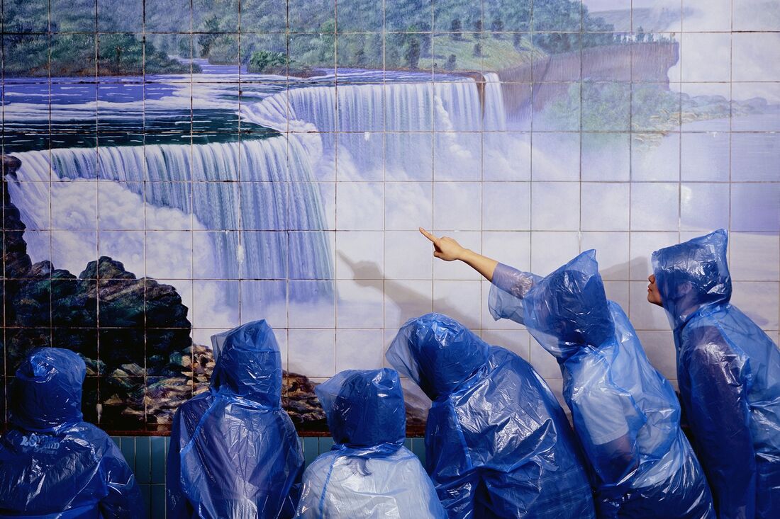 Something changed in Rhee’s work in 2007, as she planned a trio of video pieces titled swan, Polar beare niagara, filmed in a Korean bathhouse whose tiled walls have been painted with the titular themes. In swan e Polar bear, a static shot focuses on a patch of bath water and the mural behind it as Rhee slowly swims back and forth across the pool, sometimes creating the illusion of being immersed in the same landscape as those creatures. In niagaraRhee worked with actors, dressed in cheap plastic bag raincoats, who huddle together and excitedly point to the mural of the waterfall as if they were in the actual tourist spot.
