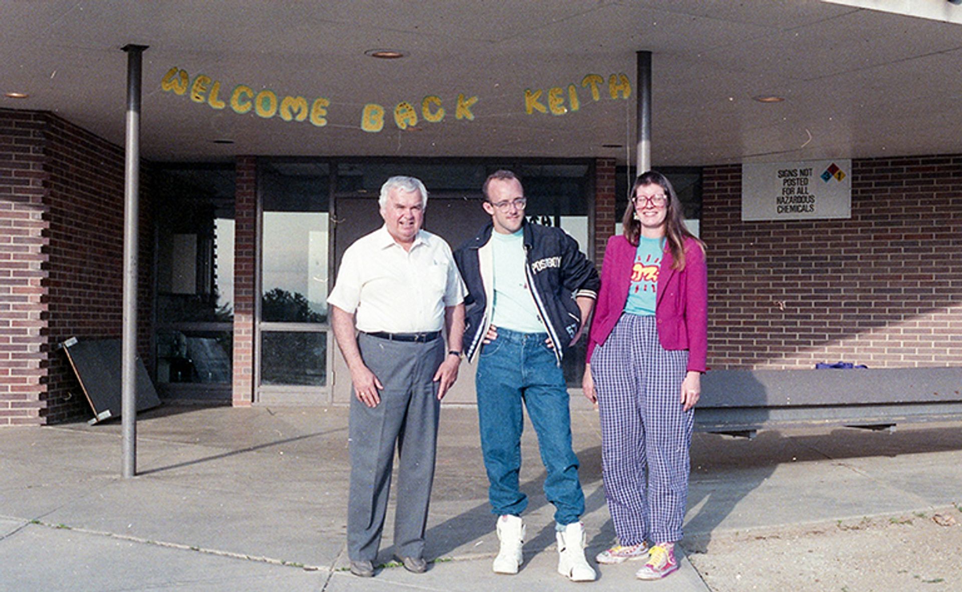 Paul E. Davis, the school principal, with Keith Haring and art teacher Colleen Ernst