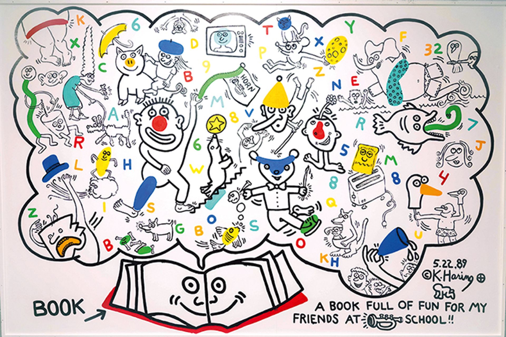 When he returned on May 22, 1989, Haring created the mural as a gift for the school, improvising – with input from the students – an illustrated bubble emerging from a book. He started with a variety of shapes, lines and letters that he then transformed, such as a folded patch of turquoise that became the rubber ring around an elephant falling from a surfboard between the letters “E” and “F.” An orange triangle became the beak of a duck, and a red circle served as the nose of a clown waving a flag with the image of a horn. This pictogram for “horn” is used again in Haring’s inscription at the bottom: “A book full of fun for my horn school friends!!”